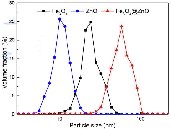 Particle size distribution of Fe3O4, ZnO and Fe3O4@ZnO nanoparticles.