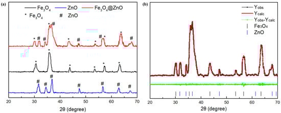 XRD analysis of synthesized Fe3O4, ZnO and Fe3O4@ZnO nanoparticles and Rietveld refinement of the XRD data of the Fe3O4@ZnO composite were shown in Figure 5. As shown in Figure 5a, the characteristic peaks and Bragg lattice planes reported at 30.08° (220), 35.42° (311), 43.08° (400), 53.56° (422), 56.98° (511) and 62.63° (440) are related to Fe3O4 structure, while the characteristic peaks and Bragg lattice planes reported at 31.72° (100), 34.44° (002), 36.21° (101), 47.49° (102), 56.51° (110), 62.81° (103) and 67.86° (112) are related to ZnO structure, which are in accordance with the patterns of standard pure Fe3O4 and ZnO, respectively [41,42]. Almost no obvious impurity peak was observed, which confirmed the high purity for the synthesized samples. As shown in Figure 5b, Rietveld refinement with good fit (goodness of fit x2 = 1.19) was carried out to obtain more crystal phase information of the composite. Parameters for Fe3O4 (crystal structure: cubic; lattice constant: a = 8.372 Å; space group: Fdm) and parameters for ZnO (lattice constant: a = 3.249 Å, c = 5.208 Å; crystal structure: hexagonal; space group: P63mc) were obtained. Meanwhile, the mass ratio of Fe3O4 and ZnO (4.91:1) in the Fe3O4@ZnO NCs from the Rietveld refinement is consistent with the EDS test within the range of allowable error. The results revealed that Fe3O4@ZnO NCs with a high purity were successfully synthesized.