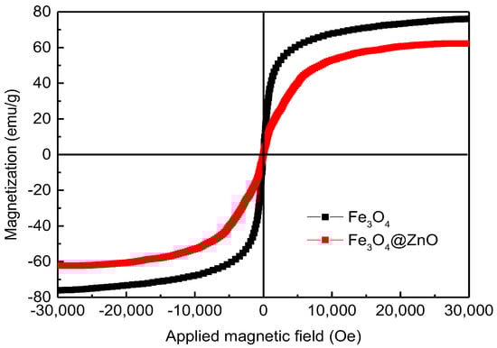 Figure 6 shows the magnetization of the Fe3O4 and Fe3O4@ZnO samples. It is clearly observed that the magnetization curves for the measured samples are S-shaped. When the magnetic field is zero, the remanence and coercive force are close to zero, indicating that the synthesized Fe3O4 NPs and Fe3O4@ZnO NCs possess good soft magnetic and practically superparamagnetic properties. The saturation magnetization measured for pure Fe3O4 NPs is 76.03 emu/g, while the saturation magnetization of Fe3O4@ZnO NCs decreases slightly but still maintains a high value of 62.26 emu/g. The high magnetization ensures that the Fe3O4@ZnO NCs have strong magnetic response ability and are easily separated from the liquid phase by magnetic field during quantitatively measuring the settlement rate of NCs (seen in Section 2.5). On the other hand, Fe3O4@ZnO NCs is simply recycled from the dispersed solution by using a magnet (seen in Section 3.3). What is more, the mass ratio of Fe3O4 and ZnO calculated from the comparative saturation magnetization is 5.02:1, consistent with the above tests (EDS analysis and XRD analysis), which further proves the purity of the synthetic Fe3O4@ZnO NCs.