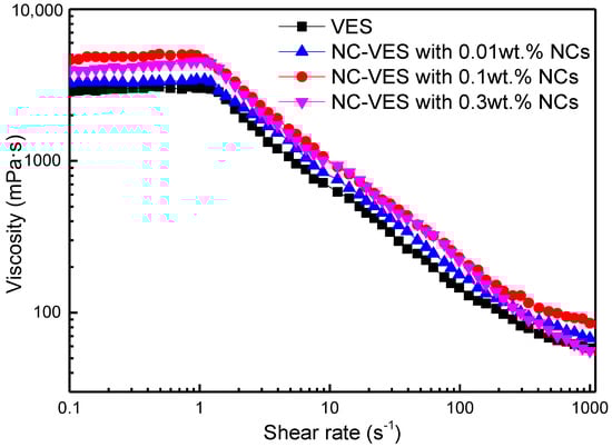The shear rate-dependent viscosities of the VESFF for different NC concentrations was studied with shear rates ranging from 0.1 to 1000 s−1 at 25 °C (tested with an Anton Paar rheometer, Physica MCR 302, Anton Paar GmbH, Graz, Austria). Figure 7 shows that the viscosity remains unchanged at low shear rates, while a notably reduced slope is observed under high shear rates, and the shear-thinning phenomenon occurs in all samples. The dependence of viscosity on shear rate is usually explained by shear banding behaviour, which has been reported in previous research results [43,44,45,46]. It is found that the NCs can improve the viscosity of the VES system. When the concentration of the NCs is low (0.01 wt.%), the viscosity increases but is not clear compared with the VES without NCs. When the NC concentration reaches 0.1 wt.%, the viscosity at 170 s−1 of the NC-VES is higher than VES without NCs. However, when the NC concentration is higher (0.3 wt.%), the viscosity of NC-VES decreases sharply at high shear rates.
