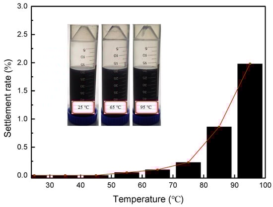 All samples were heated to the corresponding experimental temperature by a water bath and held for 10 h, then the settlement rate of NCs in each sample was obtained by weighing and calculation, as shown in Figure 9. The results show that when the temperature increased from 25 to 65 °C, the settlement rate of NCs increased from 0 to 0.1%, while almost no sedimentation phenomenon occurred, indicating that the NC-WLM network structure of the system was very stable in the low to medium temperature range. As the temperature continued to rise, the sedimentation rate increased slightly, but even at a high temperature of 95 °C, the settlement rate was only about 2%, indicating that the temperature resistance of the system was very good. Conventional VESFF is a WLM network structure formed by the spontaneous aggregation and self-assembly of high-concentration surfactant molecules, which has a specific viscoelasticity and can meet the needs of fracturing in medium- and low–temperature reservoirs. However, the WLM structure in traditional VESFF is easily broken at high temperatures, because the interaction between molecules such as van der Waals forces and hydrogen bonding forces weakens and the stability of aggregates decreases [23], leading to a sharp decrease in the viscosity of the system, which severely weakens the performance of the fracturing fluid.