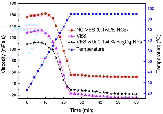 The viscosities as a function of time at 95 °C with a constant heating rate of 3 °C/min and a shear rate of 170 s−1 are displayed in Figure 10. When the temperature is lower than 60 °C, a slight increase in viscosity was observed in all three curves. However, as the temperature continues to increase to 95 °C, the viscosity of the samples decreases sharply. The viscosity of VES with Fe3O4 NPs is lower than that without NPs at 95 °C. The reason is that a certain amount of surfactant molecules are adsorbed on the surface of Fe3O4 NPs, resulting in a decrease in the surfactant concentration involved in WLM structure in the liquid phase [50]. Compared with the other two systems, the high-temperature resistance of the NC-VES system is mainly attributed to the ZnO NPs on the surface of the NCs. As shown in Figure 11, the ZnO nanoparticles adsorbed on the surface of NCs possess a pyroelectric effect, releasing charges with increasing temperature. The charged NCs easily adsorb micelles and play a role in the junction of the WLM network structure. The electrostatic screening of charged WLMs promotes further growth of wormlike micelles, and maintains good stability of the WLM network structure [29]. Therefore, the NCs incorporated into the WLM network act as a skeleton-like structure, greatly improving the stability of the NC-WLM system at high temperature.