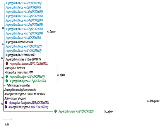 Eighteen members of Aspergillus spp., such as Aspergillus niger, Aspergillus flavus, Aspergillus fumigatus, and Aspergillus terreus were identified in total. Seventeen isolates were identified by 18S rRNA sequencing. Each identified isolate was given an accession number and stored in NCBI. The other isolate termed Aspergillus terreus 8 was identified by mat morphology and microscopic observations. However, the identification of the isolates by use of molecular tools and phylogeny was assisted by the maximum likelihood tree method and bootstrapping by Molecular Evolutionary Genetic Analysis (Mega X) software [35] (Figure 1 and Table 1).