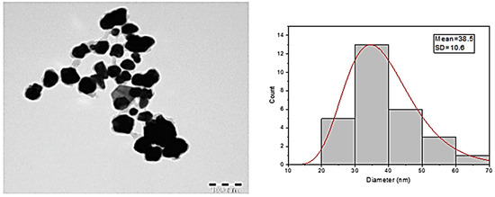After the possible encapsulates were identified, the morphology of AuNPs was studied using TEM. TEM is a widely applied technique to study the morphology of nanomaterials at various magnifications [58]. According to this technique, the synthesized AuNPs were predominantly spherical in shape (Figure 5). ImageJ software (1.8.0) predicted the size of the nanomaterials to be in the range of 38.5 ± 10.6 nm. After the morphology was studied, elemental mapping was performed by EDAX to determine the purity of the AuNPs. The composition of C (15.65%), O (0.29%), and Au (84.06%) indicates that the synthesized AuNPs were predominantly metallic gold forms. A strong and distinctive peak for AuNPs at 2.1 KeV was observed (Figure 6) [59]. After the morphology and elemental analyses were performed, the crystalline nature of the AuNPs was determined using XRD (Figure 7). The XRD peaks i.e., (111), (200), (220), (311), and (222) observed at their respective 2θ values, confirm the formation of face-centered cubic (fcc) structure of metallic gold which matched with the JCPDS No. 04-0784 [60,61]. The peak corresponding to the (111) plane is more intense than the other planes confirming that the plane (111) is the predominant orientation. The lattice constant (a) of AuNPs is calculated using the following formula (Equation (1)):