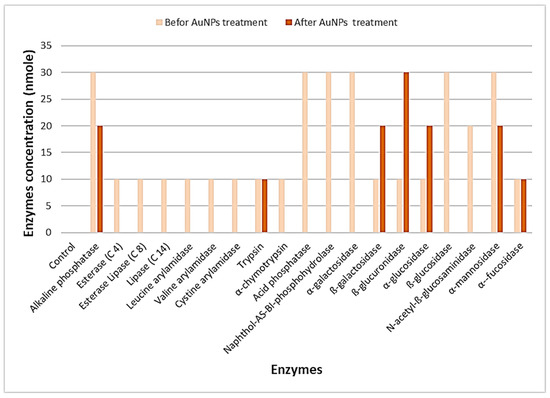 After treatment with AuNPs, the media was incubated for 7 days at 25 °C in 100 mL flasks. Subsequently, the fungal biomass was filtered through filter paper (Whatman type 1, Gillingham, UK). The filtrates were quantified for enzyme activity according to the standard API-Zym protocol depending on an increase in the intensity of color among the test sample in comparison to the control under identical conditions. A 0–5 score system was used, in which 0 determines no activity, while 5 determines maximum liberation of the hydrolyzed substrate. The concentration of enzymes was directly proportional to the intensity of the color. According to the scores 0, 1, 2, 3, 4, and 5, the enzyme activity will be 0, 5, 10, 20, 30, and ≥40 nmol, respectively.