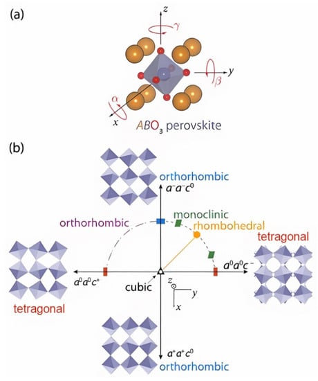 For the ideal cubic aristotype, . As lowers further, the structures distort via octahedral tilts and rotations, as shown in Figure 1b, to lower the symmetry until the perovskite phase stops being stable [2,26]. From the viewpoint of chemical compositions, the structure can therefore be distorted by doping isovalent elements of different sizes to exert a chemical pressure on the lattice.
