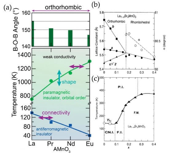 (a) The isovalent phase diagrams of rare-earth manganites with A-site composition exhibit changes in the octahedral connectivity (B-O-B bond angles, upper panels) and symmetry. Changes to the octahedral connectivity (horizontal arrows) affect the temperatures associated with magnetic and charge-ordering phase transitions, whereas periodic orderings of the octahedral shape and size (vertical arrows) occur at the orbital-ordering transition. Reprinted with permission from ref. [51]. Copyright © 2022, The Materials Research Society. (b) Lattice parameters for La1−xSrxMnO3 crystals at room temperature. (c) Electronic phase diagram of La1−xSrxMnO3. Open circles and filled triangles are the Neel (TN) and Curie (TC) temperatures, respectively. The abbreviations mean paramagnetic insulator (P.I.), paramagnetic metal (P.M.), spin-canted insulator (CN.I.), ferromagnetic insulator (FI), and ferromagnetic metal (FM). Reprinted with permission from ref. [52]. Copyright 1995, American Institute of Physics.