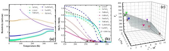 In (001) LSMO, the resistivity of thin films has been shown to be controlled via epitaxial strain. The effect on the temperature dependence of resistivity can be seen in Figure 5a [30]. Metal-to-insulator transition can be lowered considerably by using substrates that can lead to a higher tensile strain. This can be clearly seen from a systematic comparison of the resistivity vs. temperature characteristics of films on different substrates such as SrTiO3 (0.5%), DyScO3 (1.6%) GdScO3 (2.3%), SmScO3 (2.7%) and NdScO3 (3.2%). The Curie temperature and magnetization were also seen to be dependent on substrate choice (Figure 5b). In accordance with theoretical predictions by Mills et al. [74], a best-fit plane of the Curie temperature’s dependence on the bulk compressive strain (which tends to increase electron hopping probability and reduce the effects of electron–phonon coupling) and biaxial distortion ε* (which increases the Jahn–Teller splitting in the eg orbitals and acts only to reduce TC) is shown in Figure 5c.