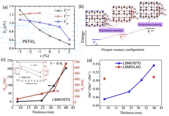 Lattice strain has also been implicated in oxygen vacancy formation which can lead to radical changes in the physical properties of these films. For instance, oxygen vacancies may act as pinning sites for ferroelectric and magnetic domain wall movements, create structural disorder and introduce electronic defects [75,76,77]. In the prototypical ferroelectric perovskite system, PbTiO3, ab initio study showed that oxygen vacancies that act as strong domain pinning centers can be modulated to a non-pinning center via compressive misfit strain by changing the formation energies of the various types of oxygen vacancies, as shown in Figure 6a,b [78]. Ferroelectric distortion stabilized in SrTiO3 by epitaxial strain has also been shown to promote the formation of oxygen vacancies [79]. In half-doped manganite, La0.5Sr0.5MnO3, the epitaxial strain was shown to modulate ferromagnetic and antiferromagnetic phase proportions by manipulating the oxygen nonstochiometry as evidenced by the change in Mn3+ and Mn4+ ratio with the increase in thickness (Figure 6d). This was seen to lead to depressed magnetization and enhanced exchange bias (Figure 6c) [80]. In La0.67Ca0.33MnO3, the epitaxial strain was implicated in the formation of a dead layer near the interface with a higher concentration of oxygen vacancies with reduced Mn valence and the unidirectional displacement of Mn ions [81].
