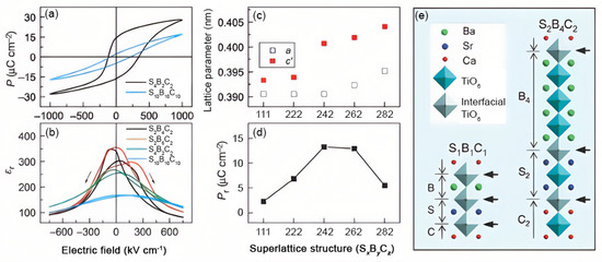 (a) P(E) curves of S2B4C2 (Pr ≈ 16.5 µC cm−2) and S10B10C10 (Pr ≈ 3.5 µC cm−2) at 1000 kV cm−1. (Note that this electric field is higher than that applied to measure the polarization of the BaTiO3 film, whose polarization is near saturation at 400 kV cm−1, whereas the S2B4C2 requires a higher electric field (∼700 kV cm−1)). (b), ε(E) curves of S2B4C2 (black line), S2B6C2 (red line), S4B2C2 (green line) and S10B10C10 (light blue line) showing differing degrees of asymmetry. (c) In-plane (open squares) and out-of-plane (filled squares) lattice parameters of various superlattices. c′ corresponds to the supercell c divided by the number of constituent perovskites in a supercell. (d), Pr values from E = ±750 kV cm−1 loops. The partially relaxed S2B8C2 structure was measured with E = ±650 kV cm−1 because of its lower breakdown strength. (e) Diagrams of supercells showing the different local environments possible for the TiO6-octahedra (bound by the same or different A-site cations). Heterointerfacial TiO6 octahedra are shaded in grey and indicated by solid black arrows. Reprinted with permission from ref. [94]. Copyright 2010, Springer Nature.