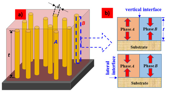 Great success in the lattice strain of much thicker films has been demonstrated in the vertically aligned nanocomposite, where the lattice strain is predominantly controlled by the vertical interface between the two individual constituents instead of the lateral interface between the film and the substrate. As shown in Figure 10a, vertically aligned nanocomposite film is composed of a regularly arranged A:B network from an array of vertically aligned nanopillar-like material A with a feature size d entrenched in a matrix of material B. Since both constituents A and B are laterally coupled across the vertical interface through the whole film thickness, as shown in Figure 10b, the vertical strain can exist in thick films. For example, lead-free, self-assembled BaTiO3:Sm2O3 nanocomposite films (up to 1.25 µm thick) were grown that exhibited tetragonality up to at least 800 °C and strong remanent polarization to at least 330 °C [100]. Similar nanocomposites, such as Ba0,6Sr0.4TiO3:Sm2O3, with film thickness in the range of 1.0 µm were also demonstrated that showed tetragonality up to at least 400 °C [101].