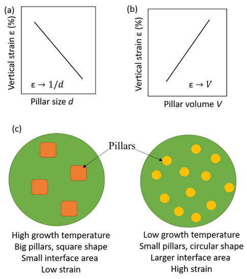 Characteristics of lateral epitaxial strain are well studied. However, the relationship between vertical strain and microstructure in vertically aligned nanocomposites is less known. It is important to know the parameters that control the vertical strain and microstructure of the nanocomposites. The final microstructure (pillar size, shape, and lateral spacing) of a vertically aligned nanocomposite film is determined by the minimization of the total free energy, which includes the elastic and interfacial energies of the system composed of the two individual phases (A and B) and the substrate. At the given growth conditions, both the size and volume of pillars predominantly determine the interfacial area at the vertical interface. It is accepted that the pillar size d, the density of the nanopillars, as well as the defects along the vertical interface determine the overall strain state of vertically aligned nanocomposites [32]. Figure 11 shows the general relationship between the vertical strain, the pillar feature size, and the volume of pillars [102]. Figure 11 also shows the general correlation among the growth temperature, pillar size, and strain state. In a system with a fixed second-phase volume, a higher growth temperature will generally produce a larger pillar size. This will result in a smaller interface area, which usually leads to a lower vertical strain. On the other hand, a lower growth temperature generally results in a smaller pillar size and larger interface area, which can lead to a larger vertical strain. In a system with a fixed pillar size, the increase in the pillar density can increase the total vertical interface area and thus lead to a larger strain. It was reported that the vertical strain in vertically aligned nanocomposites is ultimately related to the vertical interfacial area and interfacial dislocation density [12,32]. This can be understood by the following. In a nanocomposite with uniform nanopillars embedded in the film matrix, the total volume of nanopillar phase is V = n × πd2/4 × h, where n is the number of nanopillars, and h is the film thickness or pillar height. The total vertical surface area can be expressed as S = n × πd × h = πd × 4V/(πd2) = 4V/d. Since Figure 11 shows strain ε is proportional to 1/d and V then, ultimately, strain is directly controlled by the vertical interface area. The efficiency of the vertical interface coupling is related to the coherence of the interface.