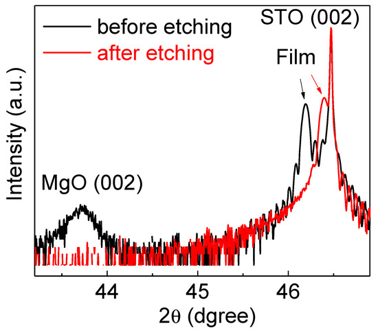 X-ray diffraction θ–2θ scans of SrTiO3:MgO vertically aligned nanocomposite films deposited on SrTiO3 substrate before and after etching off MgO nanopillars. Reprinted with permission from ref. [11]. Copyright 2019, Wiley.