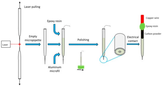 Specific issues for the preparation of disk-shaped aluminum microelectrodes are explained in Appendix A. An innovative method is proposed here for the first time. Borosilicate glass capillaries with an inner diameter of 0.69 mm, an outer diameter of 1.2 mm and a length of 10 cm were supplied by Corning (Corning, NY, USA). They were locally heated and simultaneously pulled using a laser-based automatic puller P-2000 (Sutter Instrument, Novato, CA, USA). Unlike conventional methods, the capillaries were pulled without Al microwire to avoid melting and oxidation of the metal (Figure 1). The parameters adopted for the pre-programmed pulling steps (Heat = 250, Fil = 0, Vel = 80, Del = 128 and Pul = 50) were chosen to obtain capillaries with reproducible shapes and sufficient glass wall thickness at the tip to allow for the subsequent insertion of Al microwires without the risk of breakage. Al 1050 microwires of 99.5% purity and 125 µm diameter were procured from Goodfellow (Lille, France).