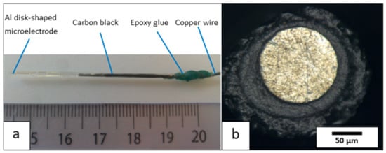 Prior to anodizing, the Al microelectrode was chemically etched in 25 g·L−1 NaOH solution at 40 °C for 2 min and then washed with deionized water. A desmutting step was then performed in a 25% v/v nitric acid solution at room temperature for 2 min. Finally, the microelectrode was thoroughly rinsed with deionized water and dried. Anodizing was carried out in a thermostatically controlled cell at 20 °C (Figure 3).