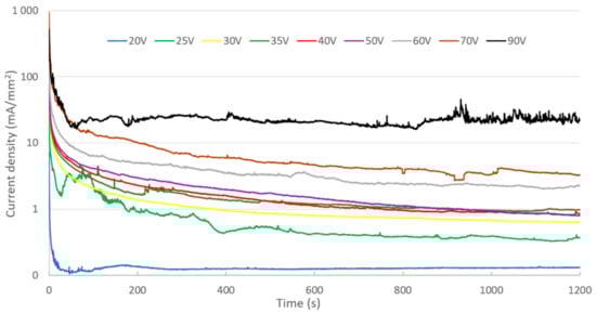 Figure 4 shows the evolution of current density during anodizing performed at a constant voltage ranging from 20 to 90 V.