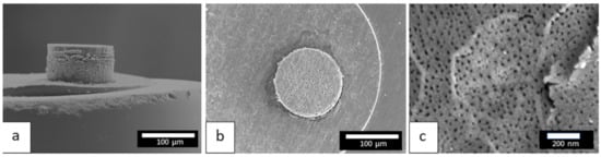 Most local anodizing methods that do exist can be classified into two categories. The first includes the local anodizing of aluminum conducted using different types of insulating mask on a macroscopic substrate: a polymer film [], a self-assembled monolayer of polystyrene microspheres [] or silicon oxide []. Techniques under the second category use small electrochemical probes as cathodes to concentrate the current on small areas of a macroscopic aluminum substrate. However, due to the insulating nature of an anodic film, conventional local electrochemical techniques, such as SECM (scanning electrochemical microscopy), cannot be applied as they lead to the scattering of the current as the film grows. To avoid this issue [,,], local anodizing is usually conducted in an electrolyte droplet. However, both approaches use macroscopic aluminum surfaces onto which a small anodic film is added.