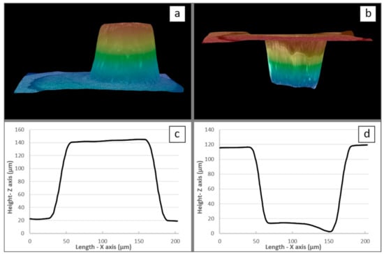 Accordingly, given the alteration of the anodic film at higher voltage values, the experimental PBR measurement was performed for voltages equal to or less than 50 V. For instance, Figure 7a,b, show 3D optical views before and after chemical dissolution of the anodic film, respectively. In this case (i.e., at 50 V as applied voltage), the oxide film thickness was found to be 218 µm, while the expansion factor (PBR) was equal to 2.10. Table 1 shows a complete set of results for the 20–50 V voltage range.