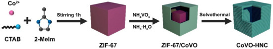 Typically, 50 mg of the synthesized ZIF-67 was dispersed into 40 mL absolute ethanol under ultrasonication to obtain a homogeneous dispersion. At the same time, 46.79 mg NH4VO3 and 0.5 mL NH3·H2O were dissolved in 9.5 mL deionized water. Then, the NH4VO3 aqueous solution was added to the ZIF-67 solution with continuous stirring for 10 min. The precipitate collected by centrifugation was dispersed in 40 mL of absolute ethanol. Lastly, the suspension in a stainless-steel autoclave was heated at 120 °C for 4 h. After natural cooling, samples were collected by centrifugation and washed several times. The sample was dried at 60 °C for 8 h to obtain the CoVO-HNC (see Scheme 1).