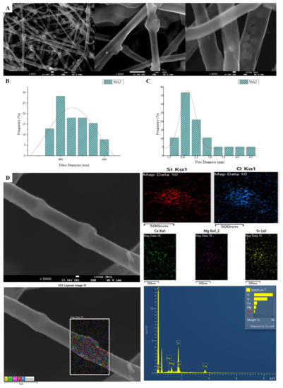 SEM microphotographs at ×4000, ×20,000 and ×40,000 magnification (A), fiber (B) and pore (C) diameter distribution and EDS analysis (D) performed at 20 kV of the sample 30A2 (composite PLGA/MSN membranes loaded with 10% w/v MSNs).