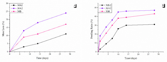 The degradation rate of neat PLGA and composite membranes was performed for 0, 7, 14, and 28 days, as shown in Figure 6. It was found that the weight loss of all groups increased over time. More specifically, composite membranes (30A2 and 30B) showed higher weight loss values than the neat PLGA membranes (30N2) group. In addition, increase in the amount of MSNs increased the weight loss. However, the hydrophilicity of the mesoporous nanocarriers containing samples (30A2 and 30B) was increased, as shown in the swelling results (Figure 6). More specifically, composite membranes showed higher swelling than neat PLGA membranes, which might be due to improvement in the hydrophilicity of PLGA membranes after the addition of MSNs [66].