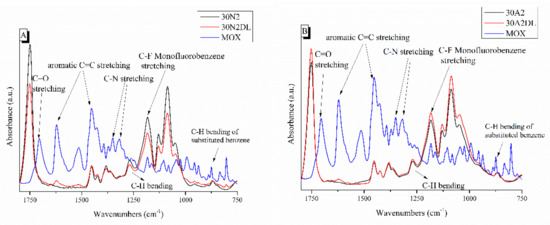 ATR spectra of PLGA-based membranes before and after loading with moxifloxacin. 30N2, 30N2DL, and MOX (A) and 30A2, 30A2DL, and MOX (B). 30N2: neat PLGA membranes, 30N2DL: drug-loaded neat PLGA membranes, 30A2: composite PLGA/MSN membranes, 30A2DL: composite PLGA/MOX-loaded MSNs membranes.
