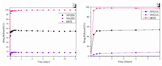 The in vitro release rate of moxifloxacin from fibrous and composite fibrous electrospun membranes at pH 7.4 after 12 days (A) and after 6 h (B) of immersion in PBS. 30N2: neat PLGA membranes, 30A2: composite PLGA/MOX-loaded MSNs membranes.