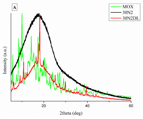 It is well known that the crystallinity of the pharmaceutical ingredient affects the dissolution rate and bioavailability. For this reason, XRD studies were performed to examine the crystallinity of MOX before and after its adsorption onto MSNs and the electrospun membrane. Figure 11A shows the respective patterns of the neat membranes (30N2) which are amorphous in the region between 5 and 60° and of MOX, which is highly crystalline, showing its distinct peaks at 5.96, 8.66, 10.28, 14.63 and 17.56° at 2θ. We observed that in loaded PLGA polymer some lower intensity peaks, close to the moxifloxacin peaks, were recorded. These peaks may be attributed to the different crystal form of moxifloxacin compared to the neat drug [72]. The absence of distinct diffraction peaks, after the adsorption of MOX in MSNs (MSNsDL) shown in Figure 11B, suggests amorphization of the drug in the mesoporous carrier. This amorphization could be due to the high dispersion of MOX on the mesopore surface of MSNs or to interactions taking place between silanol groups of MSNs and MOX [73].
