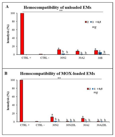 Hemocompatibility assay of electrospun membranes after direct exposure to healthy human erythrocytes was performed after 60 min and 24 h of incubation. Figure 13 presents the hemolytic activity of the newly synthesized electrospun membranes at body temperature (37 °C) after 24 h of exposure. The tested biomaterials did not induce hemolysis 60 min after direct contact with the healthy erythrocytes. Hemolysis appeared only at 24 h of incubation for 2 mg of samples for all the unloaded membranes tested (Figure 13A). The hemocompatible mass for all the tested membranes was found to be less than 1 mg. Moreover, loading with MOX appeared to be protective for erythrocytes, indicating the positive role of drug loading in electrospun membranes.