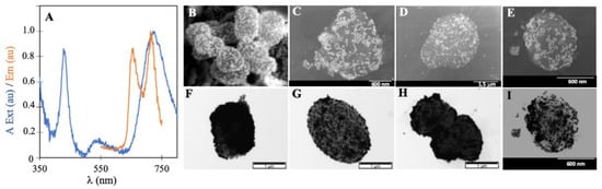 Porphyrin-nanogold (CaCO3-TMPyP)-PSS-PAH-(PSS-AuNR) PEC’s hybrid. (A) Absorption (blue) and emission (orange) spectra in water. (B–E) SEM and (F–I) TEM images of typical PEC’s hybrid, showing gold nanorods bright (B–E) and dark (F–I) nanometric structures randomly distributed on the surface of porphyrin embedded polyelectrolyte microcapsules (micrometric round structures; dark (B–E) and bright (F–I)). Images (E) and (I) are, respectively, SEM and TEM images of the same microcapsule.