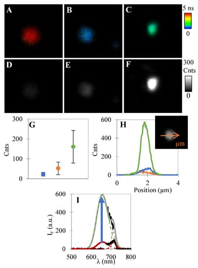 Examples of typical FLIM and intensity images (5 × 5 µm) of: (A,D) Porphyrin functionalized PECs (CaCO3-TMPyP)-PSS-PAH; (B,E) gold functionalized PECs (CaCO3)-PSS-PAH-AuNR; (C,F) porphyrin-nanogold PEC’s hybrid (CaCO3-TMPyP)-PSS-PAH-(PSS-AuNR). (G) Average counts calculated for (CaCO3-TMPyP)-PSS-PAH (orange), (CaCO3)-PSS-PAH-(PSS-AuNR) (blue), and (CaCO3-TMPyP)-PSS-PAH-(PSS-AuNR) (green). (H) Intensity profiles of the orange arrow for images (A) (orange), (B) (blue), and (C) (green). (I) Photoluminescence spectra of TMPyP in PECs (CaCO3-TMPyP)-PSS-PAH (non-enhanced emission-red) and in porphyrin-nanogold PEC’s hybrid (CaCO3-TMPyP)-PSS-PAH-(PSS-AuNR) (enhanced emission-grey) from images (A,C).