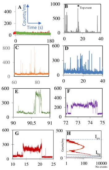 Examples of typical intensity time traces found for: (A) Controls; PECs containing only porphyrin (green) or gold nanorods (red) and for (B–H) porphyrin-nanogold hybrids. In (B), one example of the events of higher intensity from fluorescence enhanced porphyrins is signed with (*).