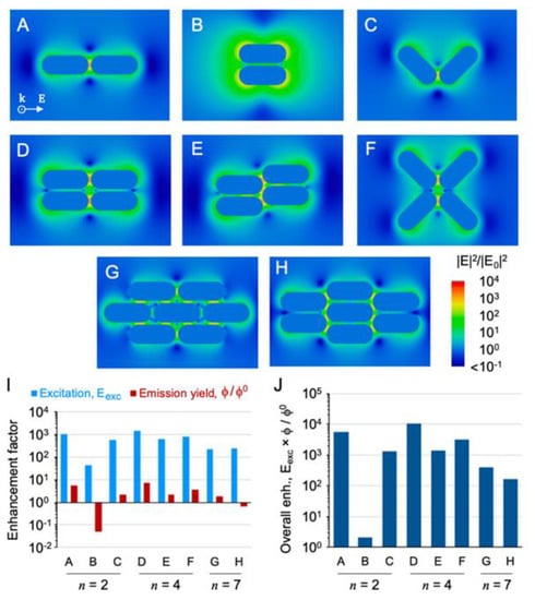 Model simulations of plasmonic hot spots between AuNRs for particle configurations of (A–C) two, (D–F) four, and (G,H) seven nanorods. (I) Calculated enhancement factors for excitation rate, Eexc, and relative emission quantum yield, Φ/Φ0. (J) Overall emission enhancement calculated for a porphyrin-like emitter in selected hot spots of simulated particle configuration (see text for further details).