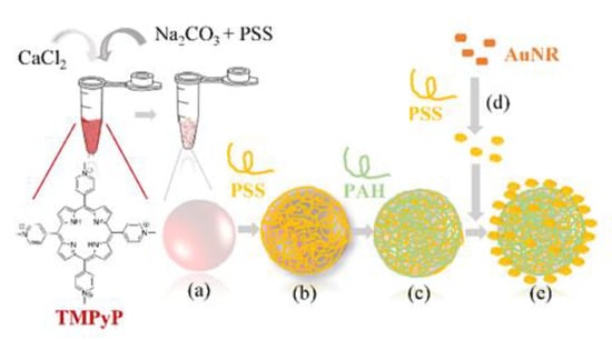 Preparation of porphyrin-nanogold PEC’s hybrid via co-precipitation and layer-by-layer mixed approaches: (a) porphyrin embedded CaCO3 microparticle CaCO3-TMPyP; (b,c) wrapping of oppositely charged polyelectrolytes leading to porphyrin embedded PECs (CaCO3-TMPyP)-PSS and (CaCO3-TMPyP)-PSS-PAH, respectively; (d) coverage of gold nanorods, AuNR, with negative polyelectrolyte PSS; (e) Porphyrin-nanogold PEC’s hybrid (CaCO3-TMPyP)-PSS-PAH-(PSS-AuNR).