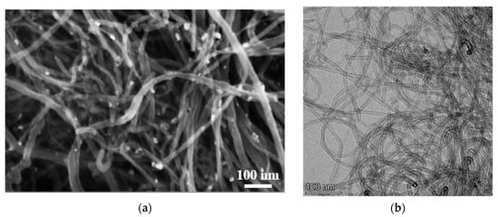 As shown in Figure 2, SWCNTs are tangled aggregates in the form of tangles consisting of individual CNTs. Such a material structure is typical for all CNTs synthesized in the form of a powder by the CCVD method. The average length of SWCNTs exceeds 200 nm, but the diameter of individual SWCNTs does not exceed 10 nm. However, as can be seen in Figure 2c, in addition to single-walled CNTs, the sample contains a certain amount of few-walled CNTs.