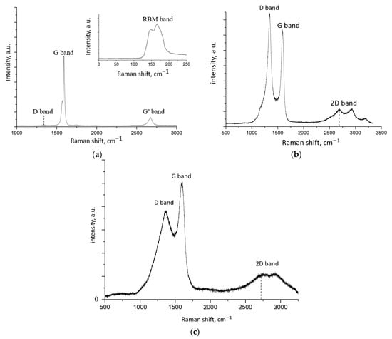 The Raman spectrum of SWCNTs contains D peak (1345 cm−1), G peak (1590 cm−1), and G‘peak (2680 cm−1), typical of CNTs. Similar spectra were observed in []. The intensity ratio of the D peak (Id) and the G peak (Ig) is 0.028, which is usually attributed by researchers to the extremely low defectiveness of CNTs []. It should be noted that it is by the intensity of the D peak that researchers estimate the defectiveness of the sp2 structure of such materials as CNTs and graphene nanostructures. Using data on the position of the RBM peak, the average CNT diameter was estimated using the formula below [].