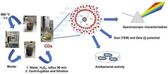 More specifically to the biomedical field, CDs gained a growing interest due to their excellent photoluminescence properties, diverse surface functions, good water solubility, low cytotoxicity, cellular uptake, biocompatibility, microbial adhesion, and theranostic properties [,]. Among these properties, antibacterial activity is one of the most appealing features in the design of new biomaterials in which nanotechnology is making fundamental contributions [,,,]. In this context, the specific physicochemical properties of CDs (e.g., size and surface charge) make them promising tools for addressing antibacterial processes, such as drug resistance, biofilms, and intracellular active/latent bacteria [,,,,].