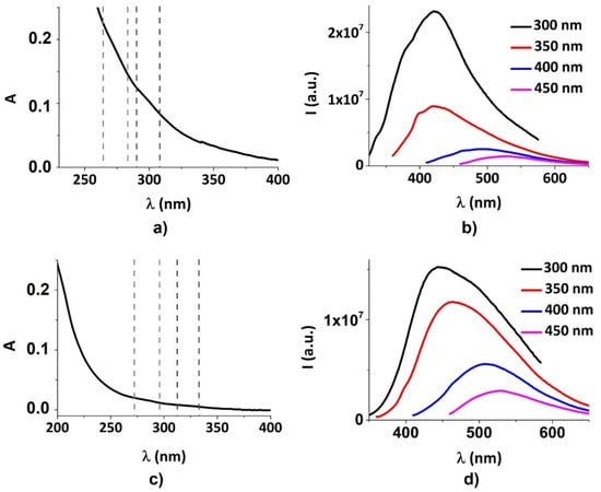 Although the absorption spectrum of CDs_C showed a trend similar to that exhibited by CDs_P, some differences are present (Figure 2a–c). First, the peaks detected as shoulders are shifted to lower energies, founding them around 280 nm and 320 nm (Figure 2c). Secondly, although CDs_C show PL, the emission spectra registered in the same excitation wavelength interval (300–450 nm) are red-shifted with respect to CDs_P, as for the absorption bands []. The emission maximum is around λem = 445 nm for λexc = 300 nm (Figure 2d).