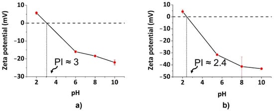 Graphical representation of ζ potential as a function of pH titration: (a) CDs_P; (b) CDs_C.