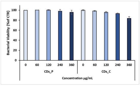 On the other hand, MTS data obtained against P. aeruginosa showed that only CDs_C at the higher concentration (360 µg/mL) exhibited a bacterial reduction of about 20%. In more detail, the bacterial viability of CDs_C was found to be 98.4 ± 1.17% at 60 µg/mL, 95.751.49% at 120 µg/mL, 93.43 ± 1.12% at 240 µg/mL, and 83.81 ± 3.5% at 360 µg/mL.