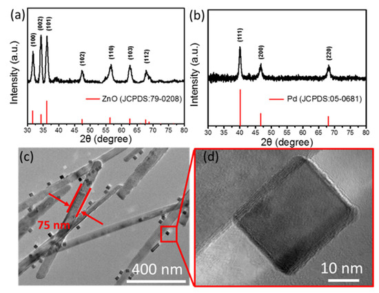 The crystal structures of the ZnO NWs and Pd nanoparticles are identified by XRD. As shown in Figure 3a, all the diffraction peaks are well matched with the standard ZnO (JCPDS card number: 79-0208). The main diffraction peaks located at 2θ = 36.1°, 31.6° and 34.3° could be assigned to the (101), (100) and (002) planes of ZnO, respectively [39]. The XRD pattern in Figure 3b shows peaks located at 40.1°, 82.1° and 46.7°, which can be assigned to Pd (JCPDS card number: 05-0681). The TEM image in Figure 3c shows that the Pd has been decorated on the ZnO NWs and that the diameter of the one-dimensional nanowires measures within 75–85 nm. The TEM image with a high magnification in Figure 3d indicates that the Pd nanoparticles have a cubic shape with a length scale that ranges from 20 to 30 nm.