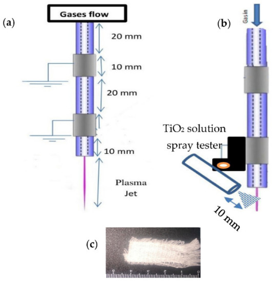 Figure 1a shows the experimental setup of the dry Ar-APPJ discharge for the application of non-thermal effects of APPJ and the study of the antibacterial treatment of woven cotton fabric samples. Figure 1b shows a wet Ar-APPJ discharge with a nanomaterial spray tester attached, which uses using titanium dioxide nanoparticle solution, porous TiO2 (p-TiO2) (MVX, Hi-tech, Kitakyushu, Japan) for the application of the wettability of TiO2 on woven cotton fabric represented by the controlled (untreated) sample, as shown in Figure 1c. The TiO2 spray tester is inclined by 45° from the outlet of the jet, with a separated distance equivalent to 10 mm for wet Ar-APPJ discharge, where the flow rate of the TiO2 solution is controlled by the percentage of TiO2 solution wettability [23,24]. There are two phenomena in the woven cotton fabric samples arising from the wet Ar-APPJ discharge: (i) heat due to a non-thermal APPJ; (ii) a photocatalytic effect due to TiO2 at different concentrations, with values of 0 g L−1 for dry Ar discharge and 0.25 and 0.5 g L−1 for wet Ar discharge.