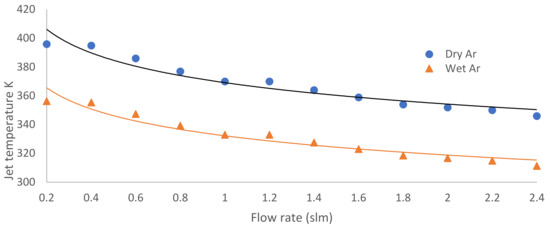 Figure 2 shows the flow rate influence from 0.2 to 4 slm on the dry argon jet temperatures (TJ), where a decrease in temperature from 396 K at 0.2 slm to 346 K at 2.4 slm occurs; for a wet argon jet temperature, a decrease from 356 K at 0.2 slm to 311 K at 2.4 slm occurs.
