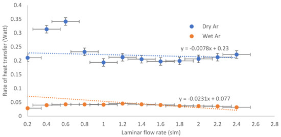 The heat loss represents the forced convection heat loss by argon through the laminar mode flow and can be calculated using Newton’s law of heat transfer as shown in Equation (2) [31]: