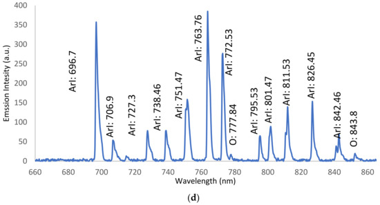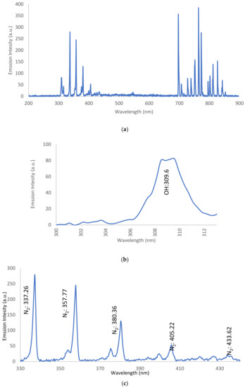 For dry Ar-APPJ discharge, as shown in Figure 4a, OES data were collected and are shown in Table 2, with the corresponding species elements, wavelength, and transitions for the hydroxide band (OH), as shown in Figure 4b; nitrogen (N2) bands, as shown in Figure 4c, and Ar lines with oxygen (O) radical lines, as shown in Figure 4d, where the presence of bands and lines is attributed to the Ar plume interacting with ambient gases and molecules. Ambient air interacts with excited Ar species, as well as high-energy electrons, in the plasma [38]: