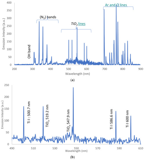 (a) Intensity of emission spectra versus wavelength for wet argon discharge. (b) Intensity of emission spectra versus wavelength for TiO2 lines.