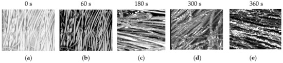 Figure 6 show SEM micrographs of the cotton fabric samples before and after APPJ sputtering treatment. Figure 6a is the control without any treatment, Figure 6b is the sample treated with dry Ar-APPJ for an exposure time of 60 s, and Figure 6c–e are samples treated with wet Ar-APPJ for different exposure times: 180, 300, and 360 s, respectively. The presence of TiO2 nanoparticles on the cotton fabric can be viewed under SEM; the particle coating increases as treatment time increases.
