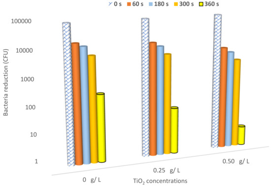 Bacterial reduction (logarithmic scale) in the cell-forming unit per milliliter (CFU/mL) as a function of TiO2 concentration: 0, 0.25, and 0.50 g/L.