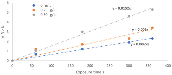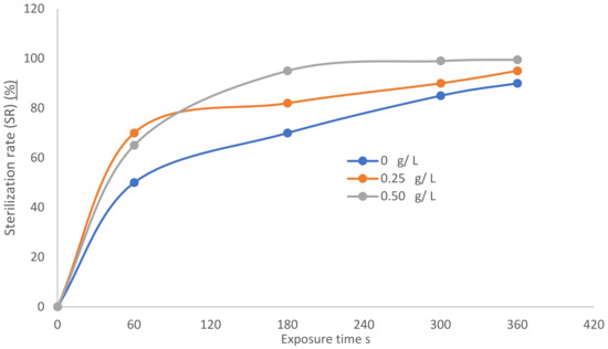 Figure 8 shows ln () as a function of exposure time at different TiO2 concentrations, exhibiting straight lines, with slope k, represented by, where k increases as the wettability of TiO2 increases. The values of the deactivation kinetic rate of the bacteria (k) are 0.0065, 0.009, and 0.0152 min−1, corresponding to the TiO2 precursor concentrations of 0, 0.25, and 0.50 g/L, respectively. Figure 9 shows the sterilization rate (SR) (%) as a function of the exposure time at different TiO2 concentrations, 0, 0.25, and 0.50 g/L, coupled with dry argon APPJ discharge: