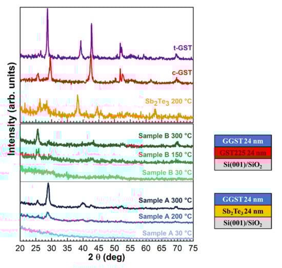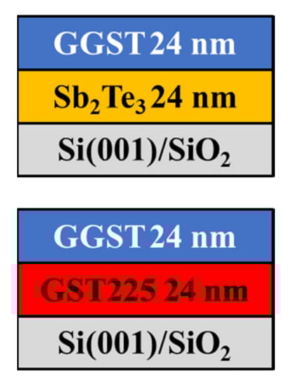 From the XRD data recorded upon annealing of both heterostructures, different behavior during the crystallization of the two systems could be found, with sample B resulting in a more stable heterostructure at increasing annealing temperatures. Furthermore, XRD measurements suggested that Sb2Te3 can act as a template for the crystallization of the GGST layer, leading for sample A to the formation of a mixed cubic–trigonal phase, unlike sample B, which maintained a stable cubic phase. Considering these results, it will be of interest to study multiple PCM layers and investigate the effect of the layer thickness on the crystallization process [,].